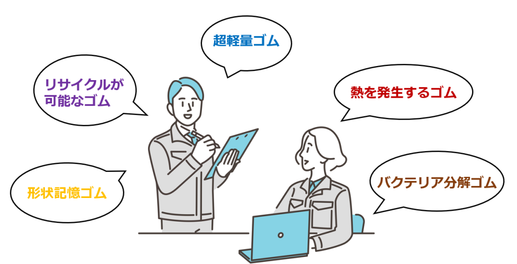 未来に向けては、リサイクル可能なゴムやバイオ素材の開発、軽量・形状記憶・発熱など高機能ゴムの可能性を広げ、さらに分解性素材など“あったら嬉しい”アイデアにも取り組みます。